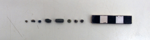 Otto vaghi di collana in pasta vitrea di colore blu, a sezione cilindrica, discoidale e quadrata, con misure differenti di lunghezza, ma costanti nel diametro e larghezza.