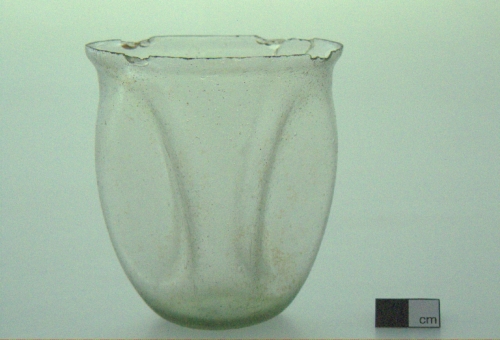 labbro estroflesso con orlo tagliato a spigolo vivo;corpo cilindrico caratterizzato da quattro depressioni ottenute a caldo; fondo quadrangolare piano. Vetro incolore, trasparente.