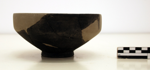 Ciotola con orlo distinto da due solcature orizzontali parallele, vasca carenata e piede a disco con lieve depressione interna.