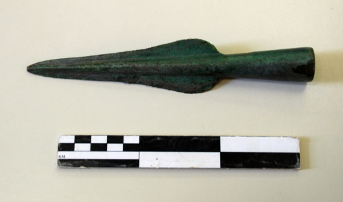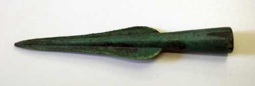 Lama foliata a base ovale con nervatura mediana, immanicatura prolungata a cannone, munita di due fori circolari passanti contrapposti.