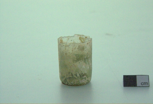 orlo tagliato a spigolo vivo;corpo cilindrico; fondo piatto. Vetro incolore, trasparente.