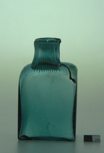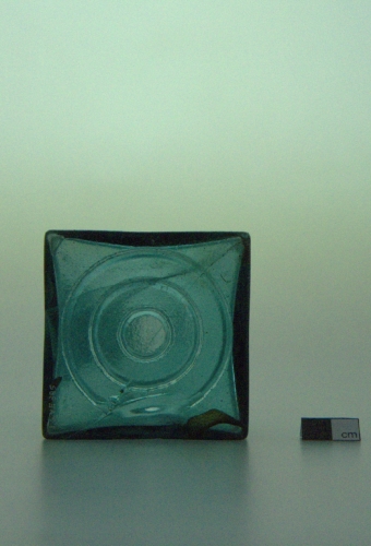labbro estroflesso, ingrossato e appiattito; breve collo cilindrico, leggermente strozzato alla base; corpo parallelepipedo a sezione quadrangolare; fondo piatto con tre cerchi concentrici in rilievo. Ansa a piccole nervature, fusa a parte e applicata a caldo, impostata sulla spalla e fissata sul collo. Vetro azzurro, trasparente.