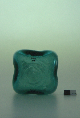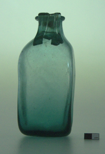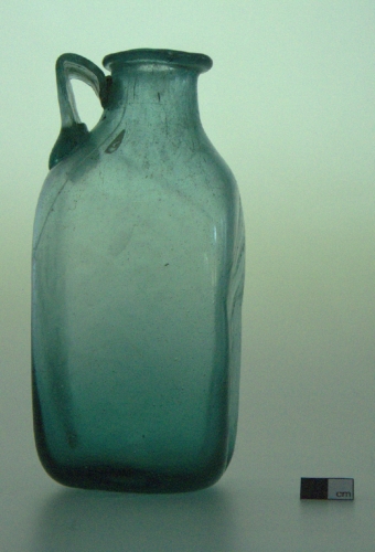 labbro estroflesso, arrotondato, ribattuto all'interno e appiattito; breve collo cilindrico;spalla spiovente; corpo parallelepipedo a sezione quadrangolare; fondo piatto con tre cerchi concentrici in rilievo. Ansa bicostolata, fusa a parte e applicata a caldo, impostata sulla spalla e fissata sotto l'orlo. Vetro azzurro, trasparente.