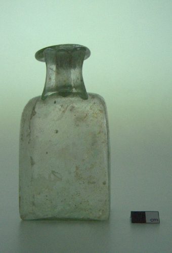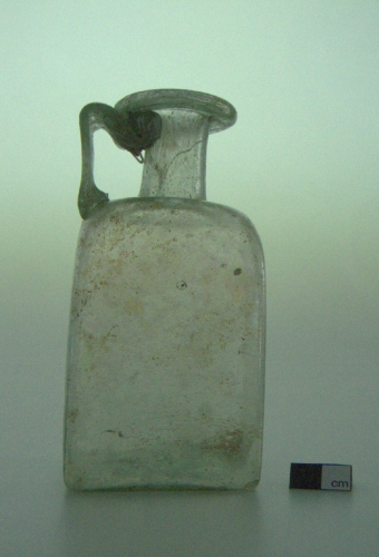labbro con doppia ribattitura, all'esteno e all'interno e appiattito; collo cilindrico; spalla smussata; corpo parallelepipedo a sezione quadrangolare; fondo piatto con marchio in rilievo costituito da un fiore a quattro petali. Ansa tricostolata, fusa a parte e applicata a caldo, impostata sulla spalla e fissata sotto l'orlo. Vetro verdeazzurro, trasparente.
