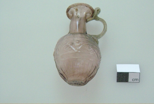 labbro esoverso con orlo arrotondato; collo cilindrico leggermente strozzato alla base; corpo ovoidale con decorazione in rilievo costituita da una fascia centrale a viticci, tra due coppie di linee anulari che la separano da due fasce decorate con costolature; fondo piatto. Ansa a bastoncello, fusa a parte e applicata a caldo, impostata sulla spalla e fissata all'orlo con un'apofisi ad orecchietta. Vetro viola,trasparente.