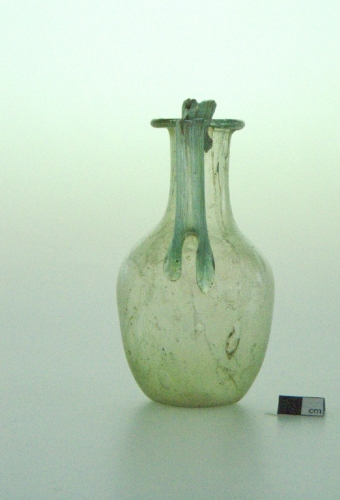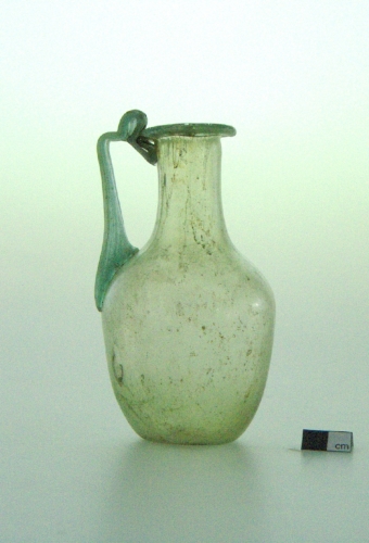 labbro estroflesso, ribattuto all'interno e appiattito; collo cilindrico;spalla ribassata; ventre troncoconico; fondo piatto. Ansa bicostolata, fusa a parte e applicata a caldo, impostata sulla spalla e fissata all'orlo con apofisi ad orecchietta. Vetro verde chiaro,trasparente.
