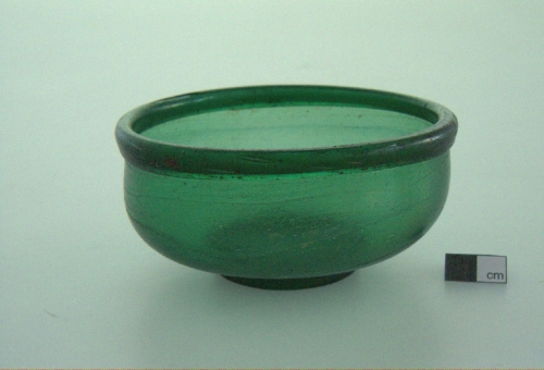 labbro estroflesso ne ripiegato verso l'esterno; corpo emisferico; piccolo piede ad anello applicato. Vetro verde,trasparente.