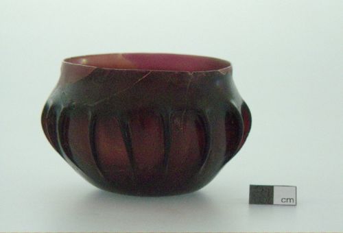 orlo diritto tagliato e levigato, corpo emisferico baccellato, fondo piano; vetro violetto semitrasparente