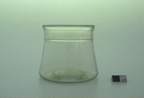 orlo arrotondato, collo distinto da filamento vitreo a rilievo, corpo troncoconico, fondo piano; vetro incolore, trasparente; filamento vitreo applicato a caldo