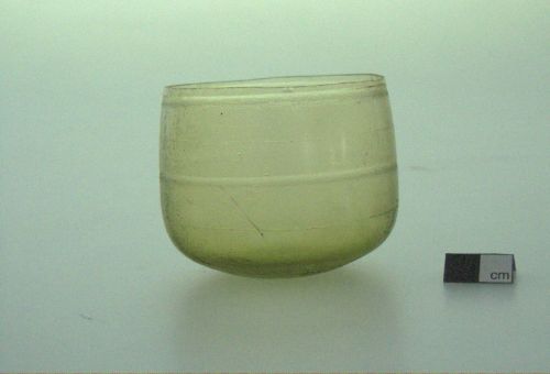orlo tagliato a spigolo vivo, corpo "a sacco" decorato da linee anulari spesse e sottili, fondo piano; vetro giallo, trasparente