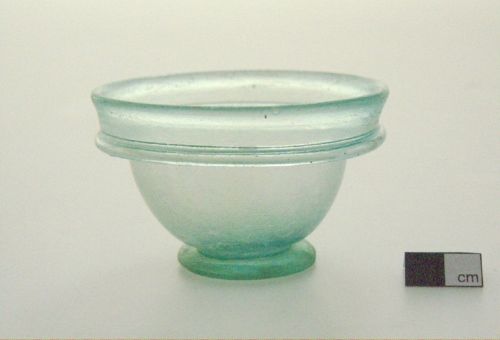 orlo leggermente svasato e arrotondato ripiegato verso il basso e poi verso l'alto, profilato in basso da un cordoncino rilevato, corpo troncoconico, piede a disco; vetro azzurrino, trasparente; cordonatura a rilievo ottenuta a caldo; piede applicato