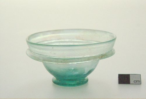 orlo svasato e arrotondato, profilato in basso da un cordoncino rilevato, corpo troncoconico, piede a disco; vetro azzurrino, trasparente; cordonatura a rilievo ottenuta a caldo; piede applicato