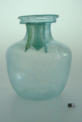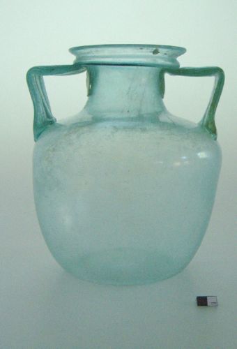labbro a doppia ribattitura, sotto il quale sono saldate a caldo due anse a nastro modellate a parte, imposttae sulla spalla appiattita, collo cilindrico, corpo globulare, fondo appena concavo; vetro verdeazzurro, trasparente
