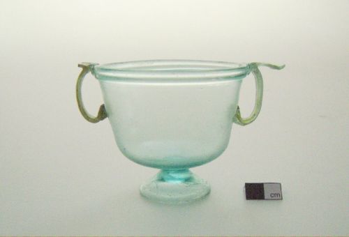 orlo verticale ribattuto, su cui sono saldate a linguetta due anse, modellate a parte e applicate a caldo, impostate sulla coppa a profilo conico, piede campaniforme modellato a parte e applicato a caldo; vetro azzurrino, trasparente