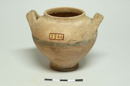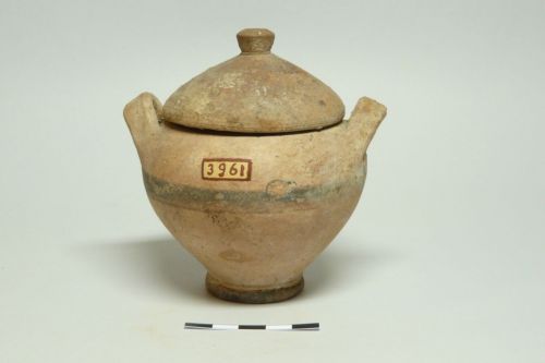 orlo diritto a margine indistinto, corpo globulare schiacciato, piede a disco leggermente concavo; anse a nastro orizzontali impostate sopra la massima espansione. Coperchio troncoconico a margine indistinto leggermente ripiegato all'interno; presa a tronco di cono rovesciato. Decorazione a fasce nere e rosse sul coperchio, alla massima espansione e sul piede