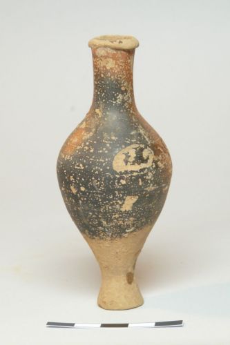 orlo ingrossato, corpo ovoide, piede a disco troncoconico; vernice nero/rossa fino due terzi della forma, collo interno verniciato; base risparmiata