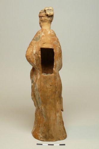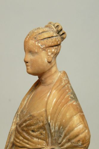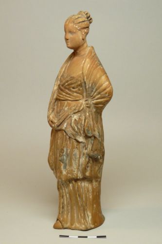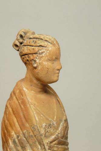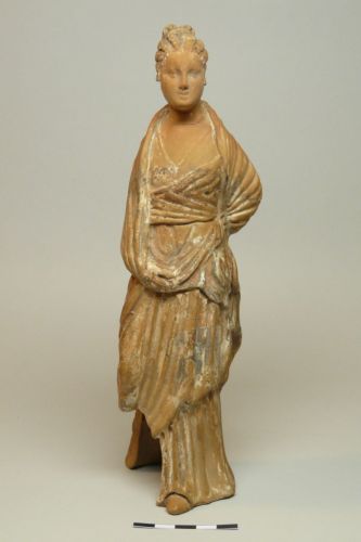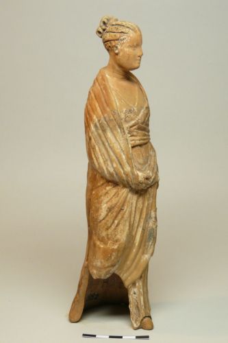 figura femminile con capelli acconciati a trecce regolari raccolte in uno chignon a quattro lobi sulla nuca; testa volta di tre quarti verso sinistra, e guarda leggermente in basso. La veste è scollata a V ed è coperta da un ampio mantello drappeggiato sulle spalle e intorno al corpo. Il braccio sinistro è piegato dietro la schiena , mentre quello destro è steso lungo il fianco e trattiene il mantello sul davanti. Dalle pieghe della veste esce la punta del piede sinistro. Il retro non è caratterizzato e ha un ampio foro rettangolare al centro. Tracce di pittura bianca