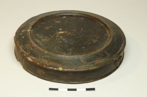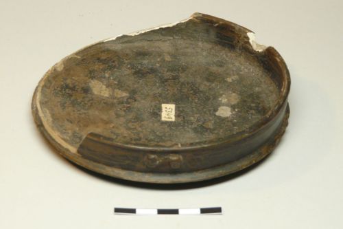 orlo a fascia con margine ingrossato e arrotondato, carena con listello, bassissimo e largo piede ad anello con base leggermente concava; sull'orlo doppia spirale applicata. Impasto beige grigiastro e vernice nera
