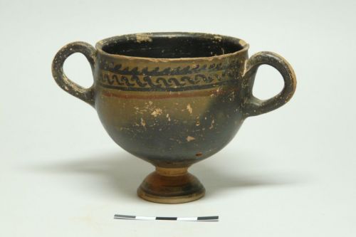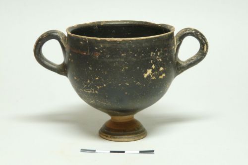 orlo leggermente estroflesso a margine assottigliato, vasca quasi emisferica, piede modanato, anse verticali a bastoncello con profilo a pseudo anello impostate sotto l'orlo e alla massima espansione; interamente verniciato, anche internamente; risparmiato solo il collo del piede. In A: in nero motivo a linee oblique sopra can corrente racchiuso tra due linee orizzontali; sotto una linea orizzontale rossa. In B: (corona vegetale a rilievo?) banda rossa tra due bande bianche