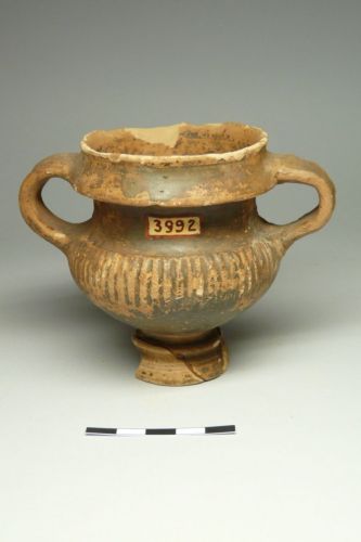 - NOTIZIE STORICO CRITICHE lo skyphos si inserisce forse in una produzione locale di ceramica di Gnathia, nota anche grazie alle fornaci trovate sull'isola nella prima metà del XX secolo; si tratta di una produzione che deriva dalla Late Canosan, da cui però poi si discosta per morfologia e sintassi decorativa e si caratterizza soprattutto per la combinazione di decorazioni incise e dipinte, in particolare in una serie di oinochai alti e con il collo stretto