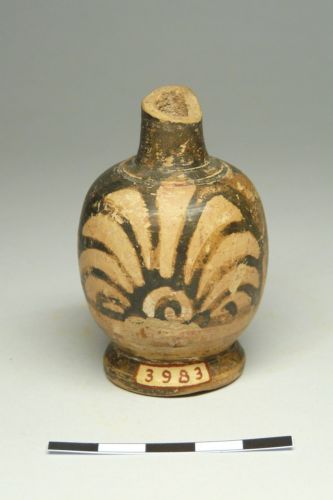 lekythos ariballica con collo cilindrico, corpo ovoide e alto piede ad anello; ansa probabilmente a bastoncello a sezione ovale, di cui rimane la traccia dell'attacco inferiore. Sul corpo, palmetta a nove lobi