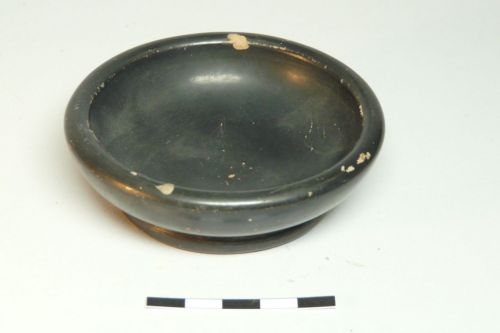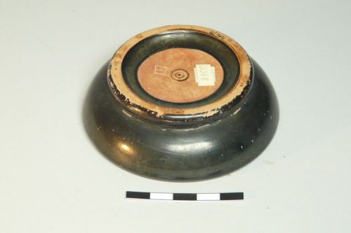 orlo arrotondato, vasca poco profonda con parete a profilo curvilineo, basso e largo piede ad anello con base d'appoggio piatta. Margine del piede e fondo esterno risparmiati; al centro del fondo esterno due cerchi concentrici e un puntino dipinti in nero