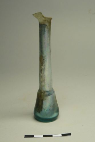 orlo svasato con bordo tagliato, collo cilindrico strozzato alla base, corpo piriforme ben distinto dal collo, fondo piano