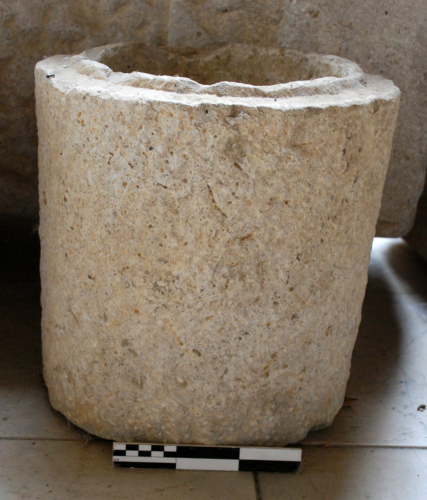 Urna cilindrica con bordo interno rilevato a profilo diritto. Lavorata a scalpello all'interno, rifinita a gradina all'esterno.