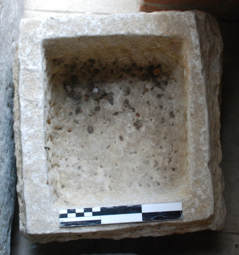 Urna a cassetta quadrangolare, con bordo rilevato a listello piatto, levigato. Sbozzato il corpo all'esterno, scalpellato all'interno.