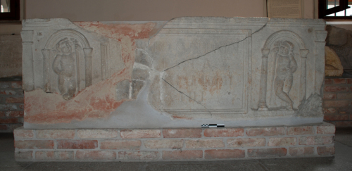 Fronte di sarcofago con iscrizione all'interno di una tabula sormontata da un arco sostenuto da due colonnine ed erote con fiaccola accesa.
