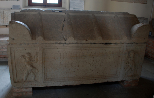 Sarcofago rettangolare con coperchio displuviato, recante sulla fronte due eroti che reggono la tabula con l'iscrizione Firmina fece per sé da viva; sui lati ghirlanda di fiori e frutti.