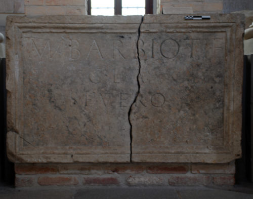 Lastra parallelepipeda corniciata con iscrizione di M.Barbius Severus.