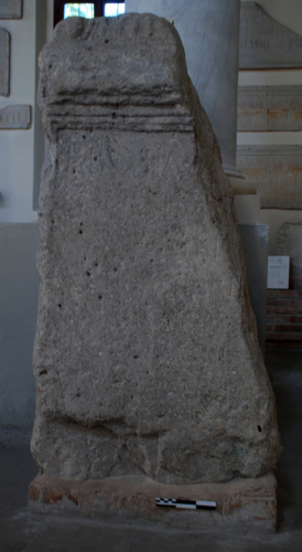 Ara parallelepipeda con coronamento centinato e pulvini laterali, con iscrizione sepolcrale di Publius Popadius.