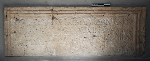 Fronte di sarcofago con iscrizione sepolcrale. Valeria peregrina arcam ex pro- / -prio suo conparavit in qua se / poni praecepit adque nominis / sui conscribi iussit