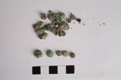 n. 35 borchiette/bottoncini in lamina di bronzo a sezione concavo-convessa con anellino di sospensione sul retro