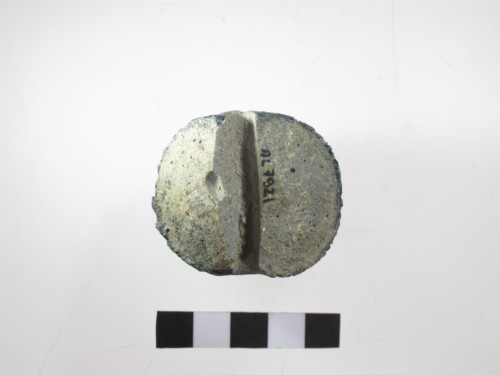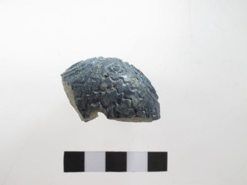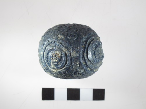Perla di eccezionali dimensioni con anima in materiale refrattario e rivestimento in pasta vitrea blu. Decorazione complessa rappresentata da tre registri di zig-zag attorno al foro sui due lati, occhi enucleati dal fondo a 4 profilature sul punto di massima espansione, piccoli occhi dello stesso tipo ma a due profilature tra gli occhi grandi, che sono collegati tra loro da due registri a zig-zag. Il riempimento della decorazione è totalmente caduto; tipo E Gambacurta G. 1987: "perle con occhi enucleati dal fondo".