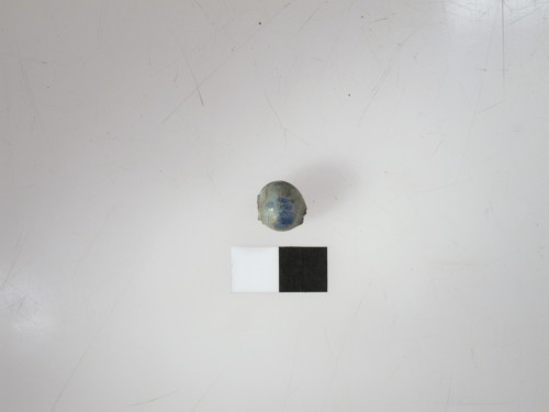 Perla sferica piccola in pasta vitrea di colore bianco con decorazioni in blu e foro centrale; tipo A Gambacurta G. 1987: perle monocrome.