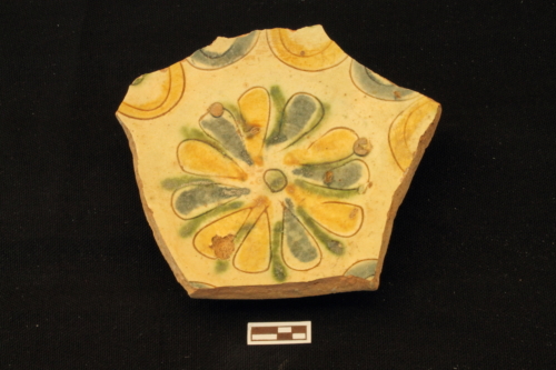 Piatto con piede ad anello leggemente umbonato e a profilo obliquo. All'interno è presente un decoro a festoni pendenti che circondano un grande fiore centrale, i cui petali sono marcati alternativamente da pennellate di colore giallo e blu. Sul cavetto si notano i segni lasciati dal distacco del treppiede di cottura.
