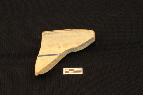 Piatto con corpo emisferico schiacciato, orlo a tesa obliqua sporgente e labbro arrotondato. Del decoro originariosi riconosce solo una sottile linea dipinta in blu parallela al bordo.