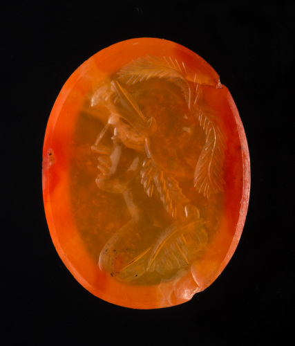 Corniola arancione di forma ovale piana/piana con inciso il busto di un guerriero. La testa, con elmo piumato, è di profilo a sinistra; tre riccioli scendono lungo il collo; il busto con la corazza è rappresentato fino all'attacco delle spalle. Da notare: il naso dritto e deciso, di cui è evidenziata la base, l'occhio ben delineato, le labbra rese da due spessi e brevi tratti all'ingiù, il mento lievemente sporgente. I capelli sono resi da piccoli tratti diagonali. L'elmo con calotta liscia e celata (elemento non antico) ha due piume, una ricadente in avanti, l'altra che scende all'indietro.