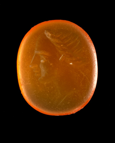 Corniola di forma ovale piana con incisa una testa femminile di profilo a sinistra, con capelli raccolti in un rotolo attorno alla testa; i capelli sulla calotta cranica sono resi con solcature parallele; il profilo è assai schematico. La rappresentazione arriva alla base del collo.