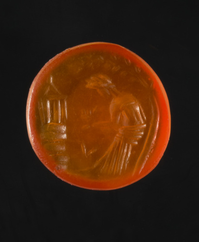 Corniola arancione di forma circolare piana/piana? su cui è incisa una scena bucolica. Sulla sinistra, un tempietto rustico su roccia, davanti al quale una donna vestita con un lungo himation (su breve e sottile linea del suolo) si curva nell'atto di deporre un'offerta (fra le braccia tese in avanti tiene un oggetto non identificabile; forse davanti a lei è raffigurato un uccello in modo estremamente stilizzato); dietro l'offerente, a sinistra, si curva un alberello che segue il margine della pietra. Lo stile dell'intaglio è rapido e sommario, ma non manca di vivacità e di attenzione per il dettaglio.