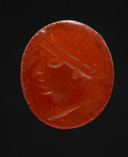 Pasta vitrea rossa di forma ovale piana/piana con raffigurazione di testa maschile con tenia legata sulla nuca di profilo a sinistra (la rappresentazione dei capelli, a striature parallele, fa pensare a una corona radiata), comprendente il collo e l'attacco del busto, ove si nota un accenno di panneggio. I capelli sono realizzati tramite una serie di segni dritti e paralleli; alla base del corto collo si intuisce un accenno di panneggio; il profilo è reso in maniera decisamente approssimativa, con tre brevi tratti orizzontali e paralleli (bocca e mento) e una linea diagonale per il naso; per l'occhio un tratto curvo. Lavoro sommario e frettoloso, decisamente grossolano.
