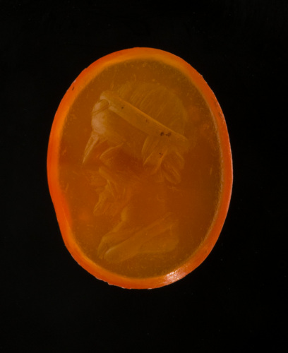 Corniola arancione di forma ovale piana/convessa con incisa una testa maschile barbata di profilo a sinistra; sulla fronte una tenia; la raffigurazione comprende l'inizio del busto, con indicazione della veste. L'incisione è abbastanza sommaria, resa con solchi grossi.