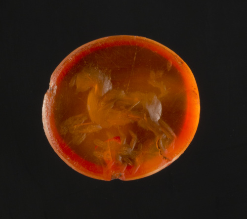 Corniola di forma subcircolare piana/piana con incisa una raffigurazione di carattere zodiacale: un leone, con criniera poco rilevata, che balza verso sinistra, sotto le cui zampe è raffigurato uno scorpione.