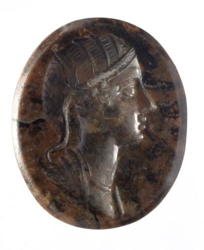 Pietra di forma ovale piana/convessa con incisa una testa femminile raffigurata di profilo verso destra, con acconciatura complessa (i capelli sono raccolti in una specie di retina, che forma un motivo a losanghe sulla coda, mentre sulla testa quattro file di brevi tratti orizzontali; sorta di cordoncino sulla fronte); busto con indicazione della veste.