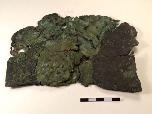 Frammento di statua (?)in bronzo, probabilmente a grandezza naturale. E'presente una decorazione superficiale poco leggibile, forse (ma difficile provarlo) corrispondente alla criniera o al vello di un animale. La qualità del frammento non permette nessuna ulteriore identificazione, se non la possibiliotà si tratti di una parte di un grande statua o gruppo scultoreo.