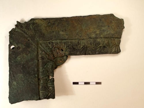 Frammento di cornice in bronzo, quadrangolare. Il frammento riguarda la zona angolare, con un bordo esterno senza decorazioni, segnato solo dalla presenza di due fori circolari, probabilmente per il fissaggio. La fascia interna, che pure ha un foro rotondo per il fissaggio, è decorata da ovuli con lancette (ovuli con saggitta interna, del tipo a kymatyon lesbico).In corrispondenza dell'angolo si trova una foglia a lobi frastagliati.