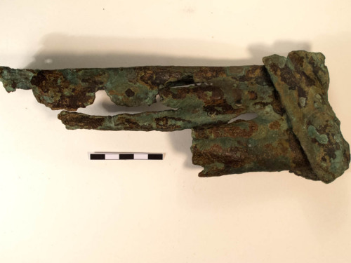 Frammento di statua (?) o di cornice in bronzo, rappresentante un elemento verticale non chiaramente definibile, terminante in alto da una fascia ripiegata. Forse rappresenta la parte di una armatura, forse la parte di un elemento verticale, forse un elemento di vestiario.