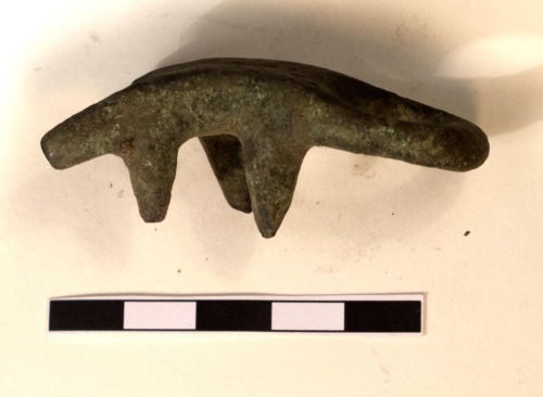 Anello gemino tricuspidato in bronzo, formato da due elementi anulari cilindrici, raccordati da un corpo mediano sormontato da tre cuspidi: una più larga, a base triangolare, e due più sottili affiancate, di forma piramidale. Gli anelli presentano deboli ispessimenti rettangolari sulla parte frontale. E' ripiegato ad arco.